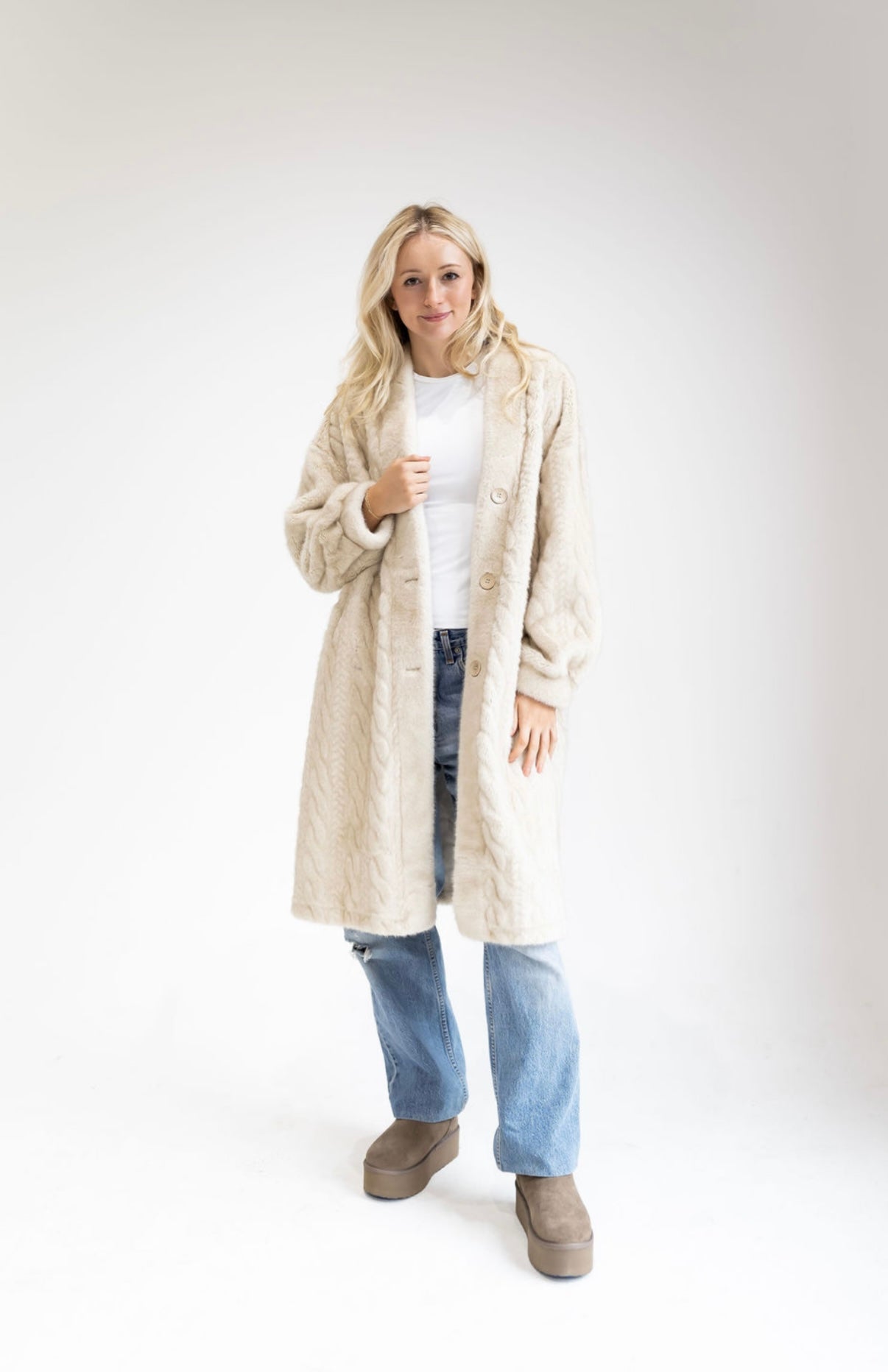 Indulge in effortless elegance with this striking faux fur coat. Crafted with a distinct cable-knit texture, it seamlessly combines the cozy comfort of faux fur with the timeless sophistication of a knitted design. The elongated silhouette creates an elegant and sleek look, while the relaxed fit and front button closure make it ideal for layering over winter outfits.